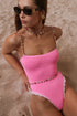 Dive into glamour with our Ariana Swimsuit, a sizzling sister-suit to our beloved Cindy! Crafted from luxe, stretchy crinkle fabric, this stunning piece is a nod to retro chic with a modern twist. Picture-perfect in pink and black hues, its ombre rhinestone straps and belt add just the right amount of sparkle to your poolside look. Get ready to make waves and turn heads wherever you go!